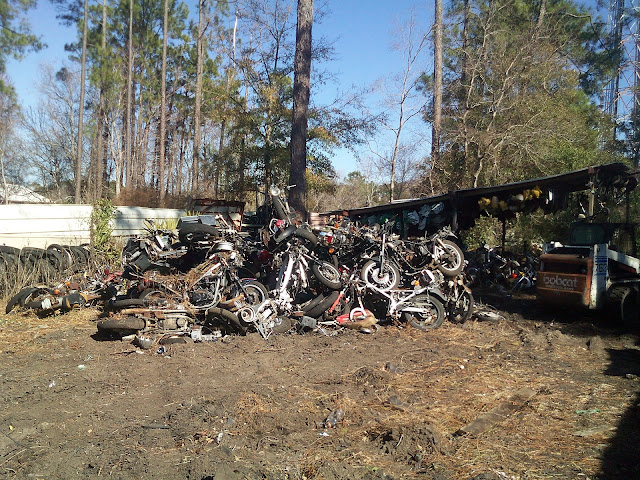 Stopped by my local salvage yard yesterday ans was confronted with this.... They're not all the way closed but 70 percent of the old stuff is now gone... There were about 6 total basket case triples in there. Mostly H1's. Not much usable on any of them but it still hurt to watch. Owner said that he's had that stuff out there 30 years and noting had moved off that side of the yard in a decade so it was better off as scrap. I guess he had a point but it still sucked to watch. I got there too late to grab any of it. He's said he's probably moving and sticking to newer plastic bikes that he can make a few dollars off of. I felt like throwing up a little.